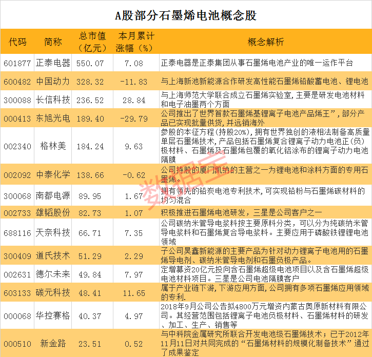 证券时报·数据宝统计显示,当前A股中共有50余股涉及石墨烯概念,与电池研发生产直接相关的有十余只,总市值超过200亿元。