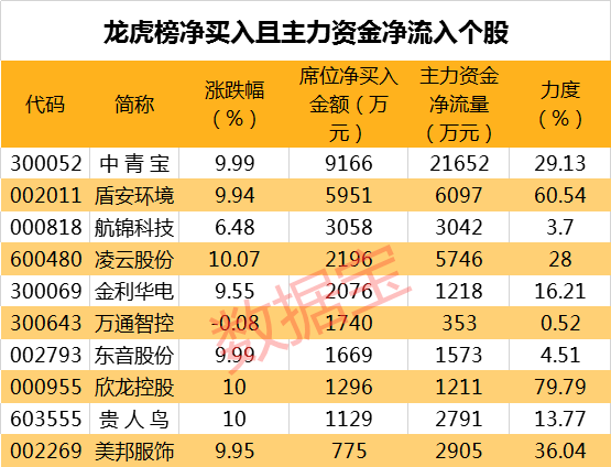 从盘口资金流向来看,主力资金净流入超千万且龙虎榜净买入个股共有9只,其中等个股资金净流入金额最大。净流入力度最大的个股有,净流入力度分别为79.79%、64.85%、60.54%。