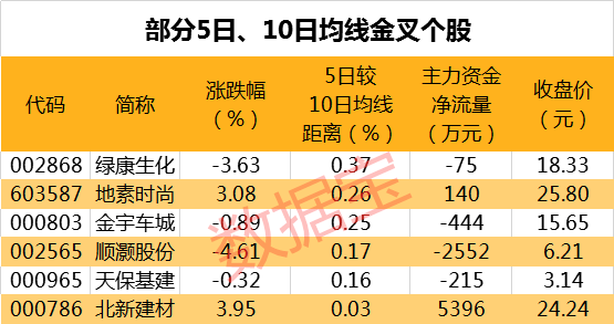 截至最新收盘,有6只A股的5日均线主动上穿10日均线,其中等个股的5日均线较10日均线距离最大,分别达0.37%、0.26%、0.25%。
