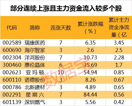 值得注意的是,129只连续上涨个股中,4只个股期间主力资金累计净流入超过亿元。其中,累计资金流入最多的为,主力资金累计流入3.45亿元。