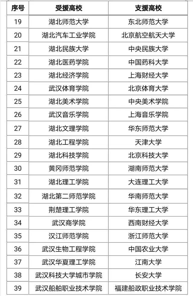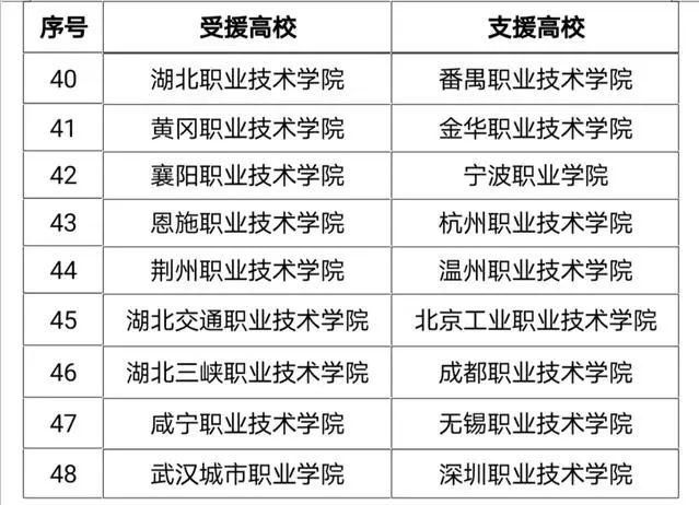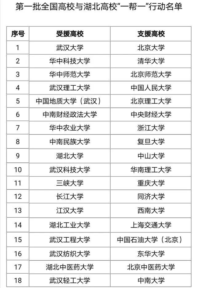 据悉,“一帮一”行动充分考虑了学校办学类型、就业工作特点和受援高校需要。首批确定48对高校开展帮扶行动,支援高校包括34所中央部委直属高校(含30所教育部直属高校)、4所省属普通高校、10所全国示范性高职院校;湖北受援高校包括8所中央部委直属高校(含7所教育部直属高校)、30所省属本科院校、10所高职院校。帮扶行动时间定为2020年4月至9月,并将根据疫情防控安排适时调整。