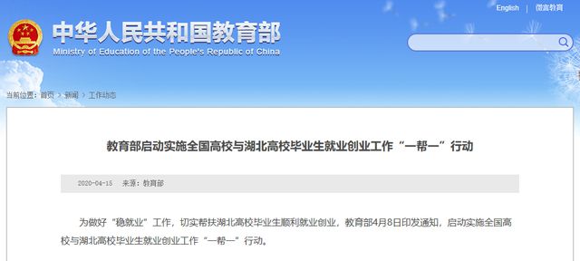 记者从教育部获悉,教育部4月8日印发通知,启动实施全国高校与湖北高校毕业生就业创业工作“一帮一”行动。