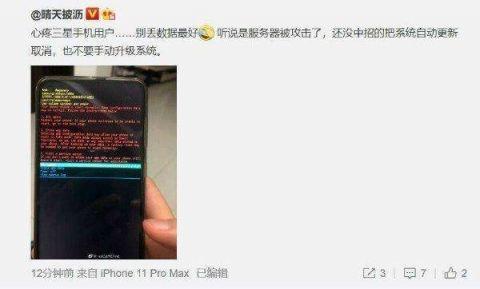 23日凌晨,多位网友在微博上爆料,部分三星手机系统崩溃,出现黑屏、乱码、无限重启等情况。