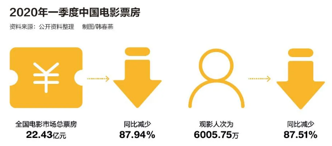 艺恩数据显示,2020年一季度,全国电影市场总票房22.43亿元,同比减少87.94%;观影人次为6005.75万,同比减少87.51%。电影票房和观影人次的暴跌,使得包括影视制作公司、宣传发行公司、院线公司在内的整个电影行业都不景气。