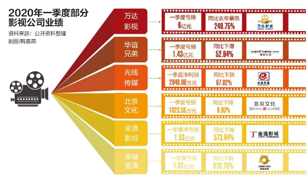 影院停业、电影撤档的背后,上市影视公司业绩一片惨淡。万达电影一季度营收同比下跌70.12%,亏损近6亿元,同比去年暴跌249.75%。中国电影一季度营收同比下降88.39%,亏损2.27亿元,同比去年暴跌163.95%。此外,华谊兄弟、横店影视、金逸影视等一季度均处于亏损状态。