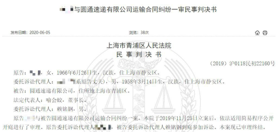 2020年6月5日,中国裁判文书网发布了上海市青浦区人民法院民事判决书((2019)沪0118民初22160号)即钱某与圆通速递有限公司运输合同纠纷一审民事判决书,判决书披露了案件的细节。