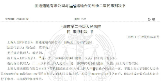 此前的2020年6月2日,中国裁判文书网发布了上海市第二中级人民法院民事判决书((2020)沪02民终3742号)即圆通速递有限公司与钱某运输合同纠纷二审民事判决书。上诉人圆通速递有限公司因与被上诉人钱某运输合同纠纷一案,不服上海市青浦区人民法院(2019)沪0118民初22160号民事判决,向法院提起上诉。圆通速递上诉请求:撤销一审判决,依法改判驳回钱某一审诉讼请求。