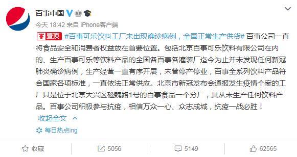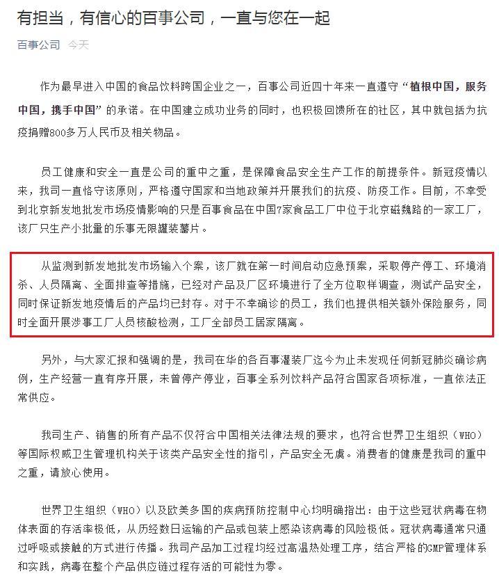 很快,百事的回应就来了。21日18时42分,百事(中国)有限公司在官方微博回应称,百事公司一直将食品安全和消费者权益放在首要位置,包括北京百事可乐饮料有限公司在内的、生产百事可乐等饮料产品的全国各百事各灌装厂迄今为止并未发现任何新冠肺炎确诊病例,生产经营一直有序开展,未曾停产停业。百事全系列饮料产品符合国家各项标准,一直依法正常供应。北京市发布会通报发生疫情个案的工厂只是位于北京大兴区磁魏路1号的百事食品一个分厂,该厂从未生产任何饮料产品。