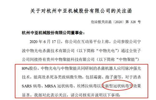 据深交所网站22日消息,中亚股份收到交易所关注函,深交所要求公司说明杀菌机器人对于消杀SARS病毒、MRSA冠状病毒、埃博拉病毒以及新型冠状病毒等效果显著的依据,是否经过相关检验验证,是否用于实践,该产品近三年的主要客户及销售收入。