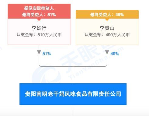 天眼查的数据显示,在2014年陶华碧退出后,“老干妈”品牌背后的贵阳南明老干妈风味食品有限责任公司由大儿子李贵山占股49%,小儿子李妙行占股51%。陶华碧仍任法定代表人和董事长。