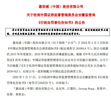 7月17日,惠而浦公告称,收到中国证券监督管理委员会安徽监管局《行政处罚事先告知书》(处罚字[2020]6号),因披露的2015和2016年年度报告虚假记载,公司及相关责任人遭到处罚。