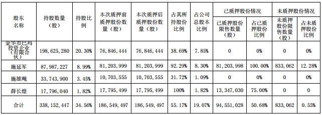 7月25日,公司发布了关于股东股份质押展期的公告。公司于 2020 年 7 月 24 日收到股东施延军及其一致行动人金华市巴玛投资企业(有限合伙)、施雄飚、薛长煌的函告,获悉其所持有的本公司部分股份质押展期。截至 2020 年 7 月 23 日,上述股东及其一致行动人所持质押股份情况如下: