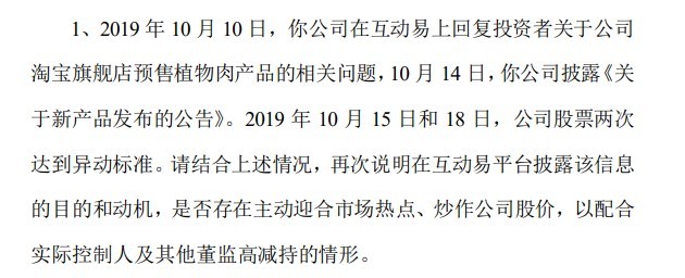 10月23日,深交所向金字火腿发去关注函,要求公司说明是否存在主动迎合市场热点、炒作公司股价,以配合实际控制人及其他董监高减持的情形