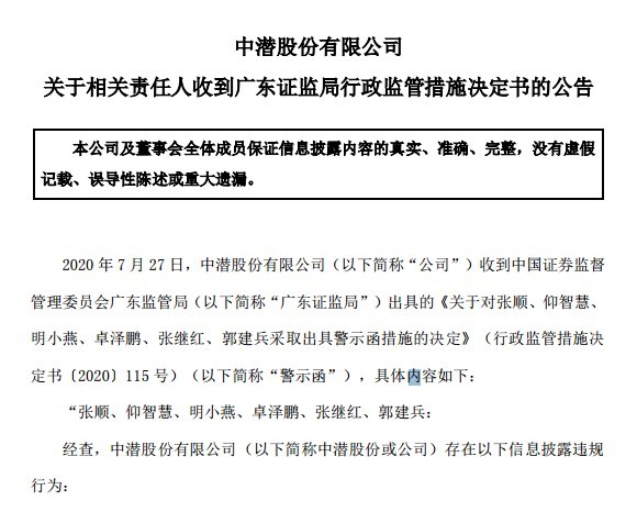 信披违规中潜股份多名责任人收警示函