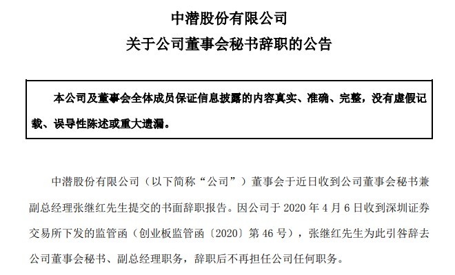 4月9日,中潜股份发布了关于公司董事会秘书辞职的公告。董秘张继红辞职的理由可谓“罕见”,因收到深交所下发的关注函,张继红引咎辞去公司董秘、副经理职务。
