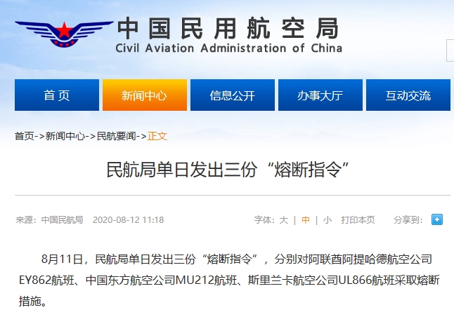 据民航局网站消息,8月11日,民航局单日发出三份“熔断指令”,分别对阿联酋阿提哈德航空公司EY862航班、中国东方航空公司MU212航班、斯里兰卡航空公司UL866航班采取熔断措施。