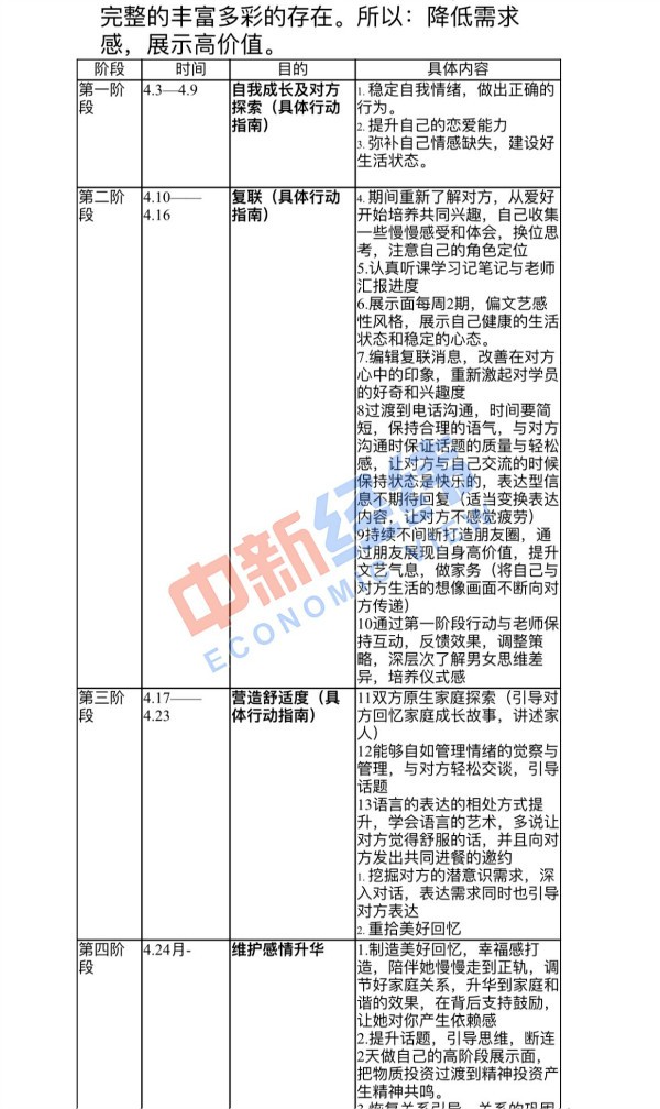 该方案中的“挽回思路”分为四个阶段,持续时长为一个月。其中,第一阶段用时一周时间,具体内容为“稳定自我情绪,做出正确的行为”等;第二周为“复联”时期,具体内容为“过渡到电话沟通,时间要简短,保持合理的语气”“持续不间断打造朋友圈,通过朋友展现自身高价值”等;第三周则为“营造舒适度”时期,要求“探索原生家庭”“重拾美好回忆”;最后阶段为“维护感情升华”时期,包括“提升话题”等内容。