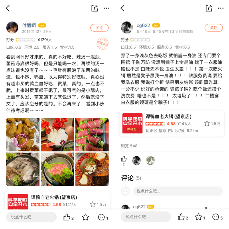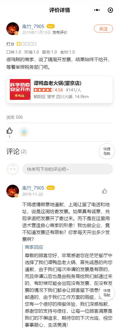 值得注意的是,谭鸭血老火锅望京店并非首次出现环境卫生与食品安全问题,大众点评留言显示,该店已多次因“凳子上全是油”、“菜品中出现头发”等遭消费者差评。不仅如此,谭鸭血老火锅望京店还被网友举报涉嫌偷税漏税,“很鸡贼的商家,说了隔周开发票,结果始终不给开,等着向税务部门举报吧”。