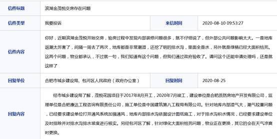 “经市城乡建设局了解,茂悦花园项目于2017年8月开工,2020年7月竣工,建设单位是合肥质然房地产开发有限公司,监理单位是合肥康达工程咨询有限责任公司,施工单位是中国建筑第八工程局有限公司。针对地库内部湿气大,潮气较重问题,已经要求建设单位打开通风系统加强通风,地库内部排水沟依据设计图纸施工,对于排水沟积水情况,已经要求建设单位及时排除并对排水沟排水坡度进行核实。另经包河区了解,针对绿化大面积枯死问题,物业正在更换,其它的会在天气凉爽时更换。”